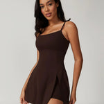 DUSK to mini sukienka z wbudowanymi szortami, odkrytymi plecami i regulowanym ramiączkiem. Luźny, swobodny krój i elastyczny materiał, który porusza się razem z Tobą. Od kortu po kawę, od treningu po spotkanie — DUSK łączy sportowy charakter z kobiecą lekkością.